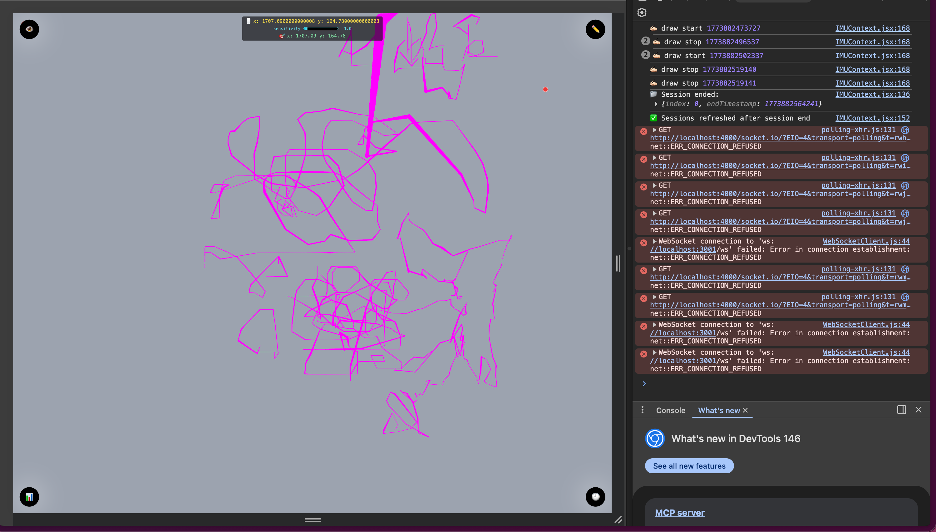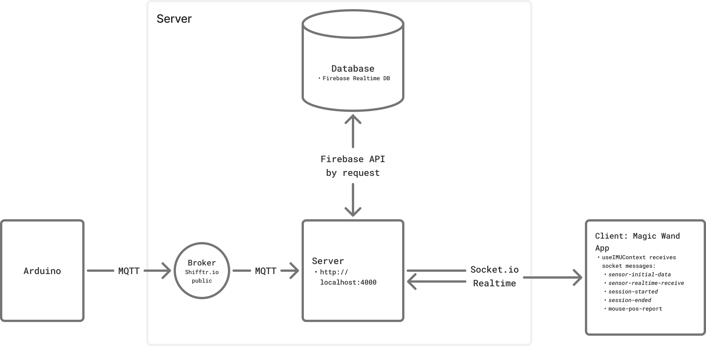 sensor-initial-data: restores initial data from db (server → client)sensor-realtime-receive: receives realtime message from server (server → client)session-started: to signal client to start drawing (server → client)session-ended: to signal client to stop drawing (server → client)mouse-pos-report: reports mouse pos to server to define where to start drawing (client → server)screen-size: reports screen size to server for optional mapping 3. Processing sensor data at processSensorData(parsed, source='mqtt'):