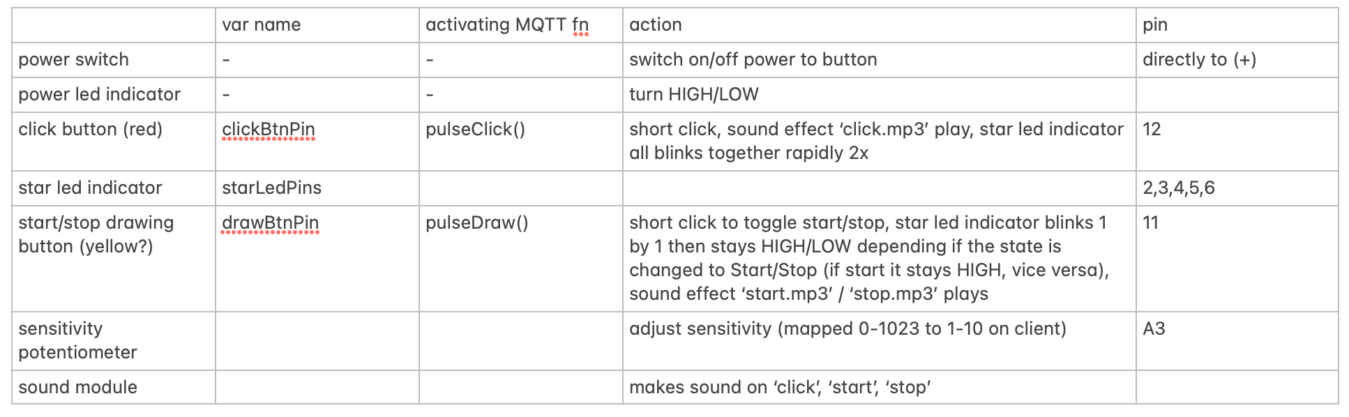 kezia/imu/power : true “publishPower(true)”kezia/imu/power : false “publishPower(false)”animateStarLEDs(), update the var drawState by toggling it between “start” or “stop” then it will trigger pulseDraw() which publish to kezia/imu/draw as “start” or “stop” (via publishControl())drawState is “start” and user clicks the click button, it will be permitted to trigger blinkAllStars() and pulseClick() and publish to kezia/imu/click as number.There is no normalization done to the IMU results and we send to MQTT via publishMessage() as: