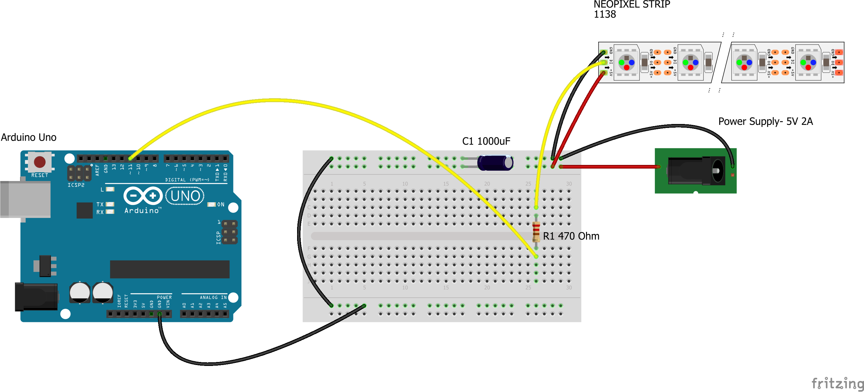 - 3 piece of 470 Ohm resistors, connected to each neopixel strips